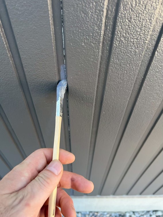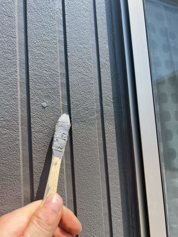 ①サイディングの収縮により生じた合いじゃくり目地の隙間を、補修材で充填している様子です。