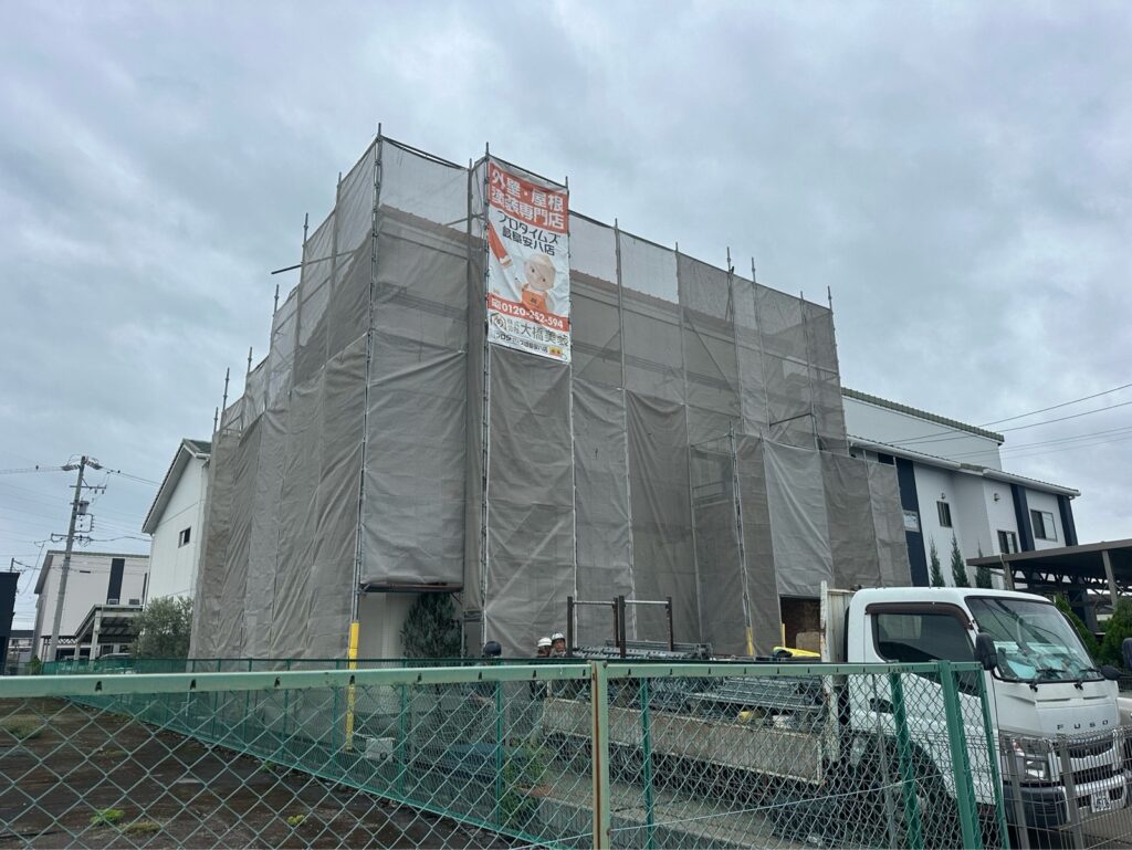 足場を組み、飛散防止のメッシュシートで養生します。