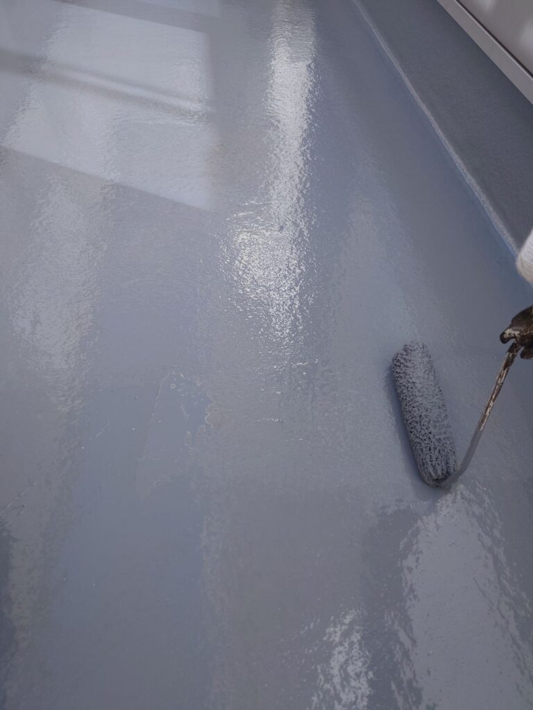 下処理後、下塗り塗装をおこない、ウレタンの防水コーティング材を塗布します。