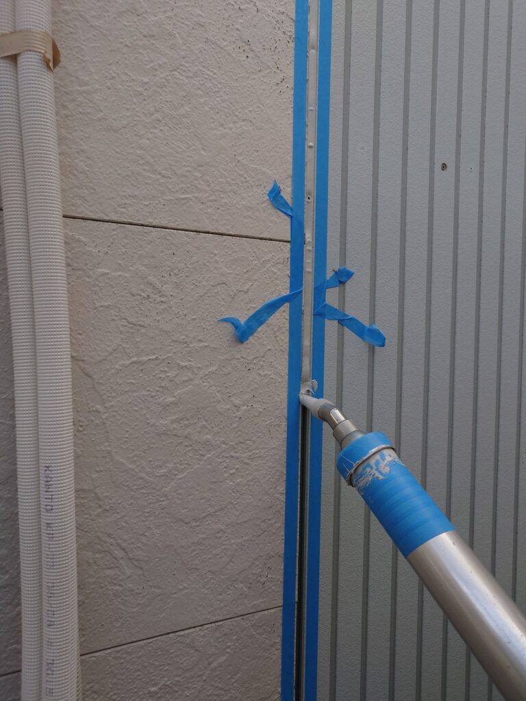 新しいシーリングを充填します。シーリングは、外壁材の継ぎ目の目地や窓のサッシ周りを埋めるために施す「充填剤」の事です。