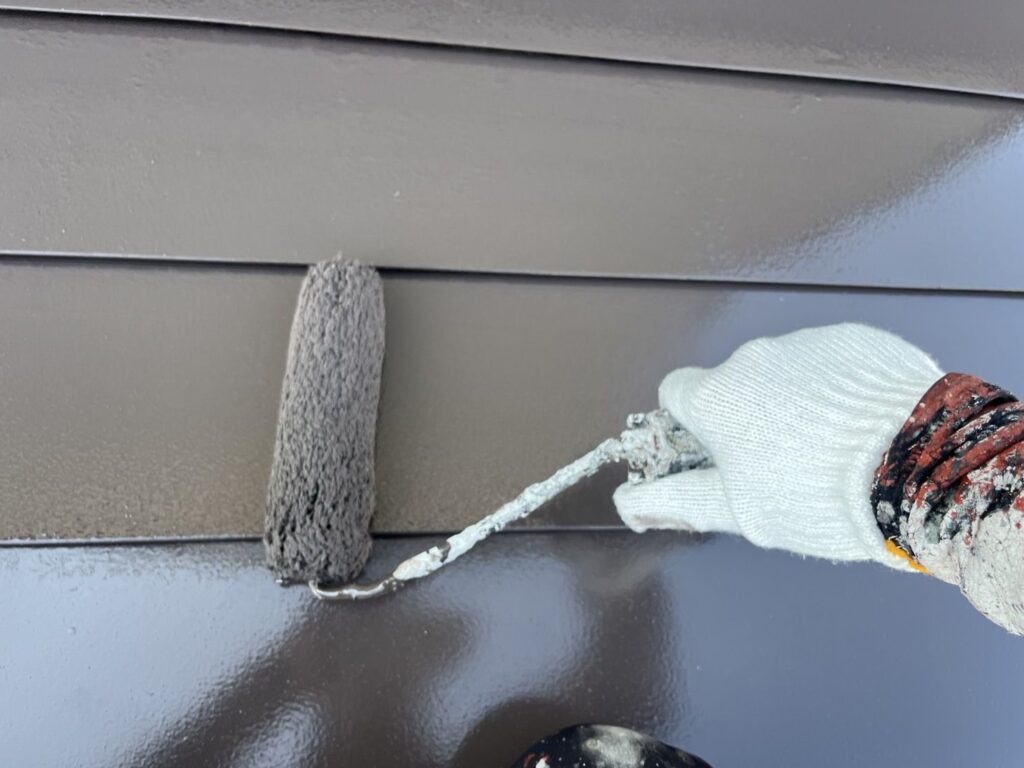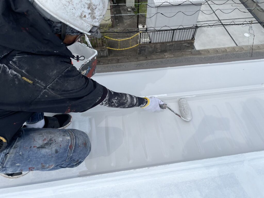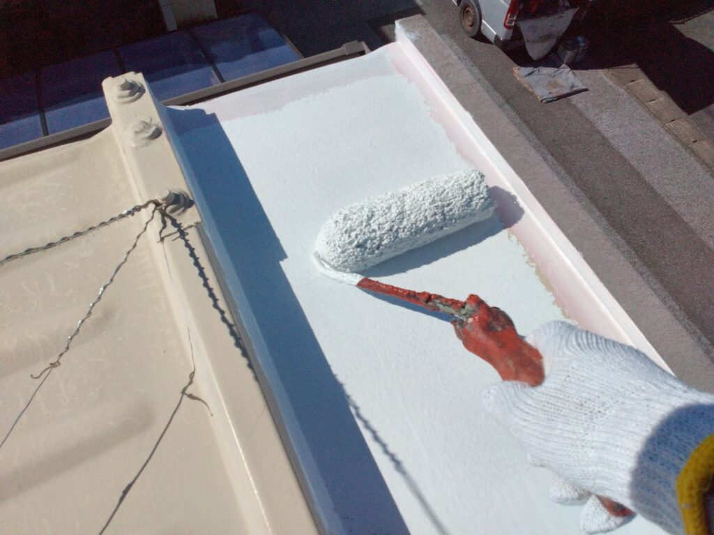 上塗りは2回行い、膜厚を付けて丈夫な屋根にします。