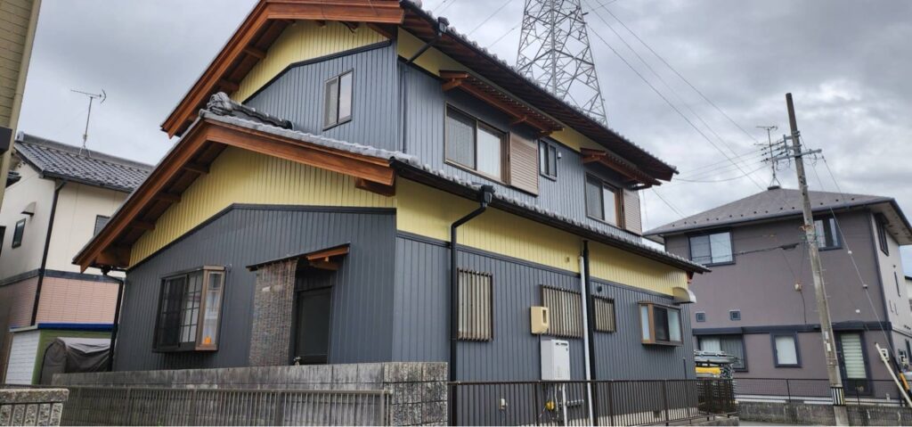 今回のお住まいは、外壁材が「トタン」と「ジュラク」という異なる素材で構成されており、